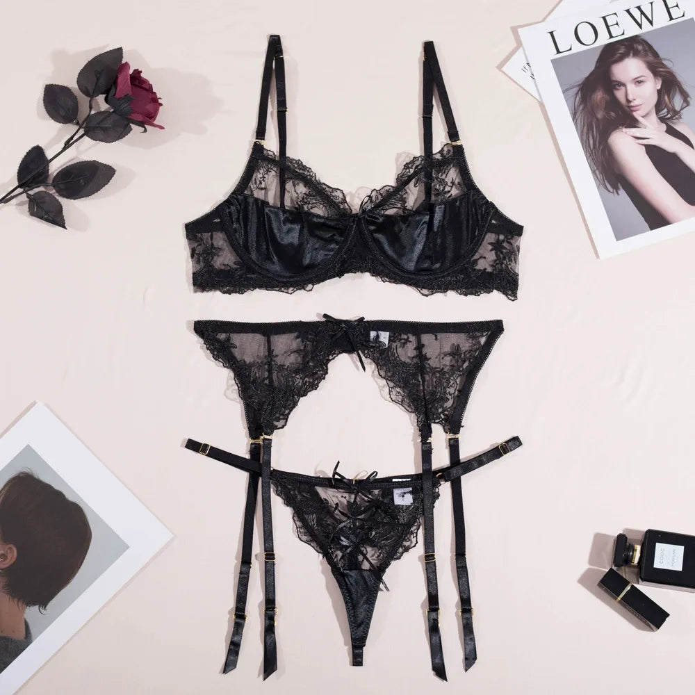 This set combines sensuality and comfort, looking luxurious and feminine. Perfect for special moments or simply to feel like a goddess. Premium quality. The set includes: • A black lace bra with delicate sheer panels. • Lace panties with charming bows that accentuate the waist. • A beautiful garter belt that adds a touch of luxury to your look. In this set, you’re not just temptation — you’re a true goddess